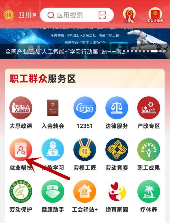 第一步:打开“职工之家”,点击“就业帮扶”板块