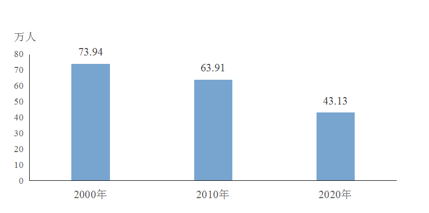 与2010年第六次全国人口普查相比,全区减少207815人,下降32.52%,年平均下降3.86%。18个镇(街道)中,凤凰街道、柔刚街道、安居镇[4]合计常住人口较2010年增加30868人,拦江镇常住人口较2010年增加4586人,其余镇常住人口均下降。