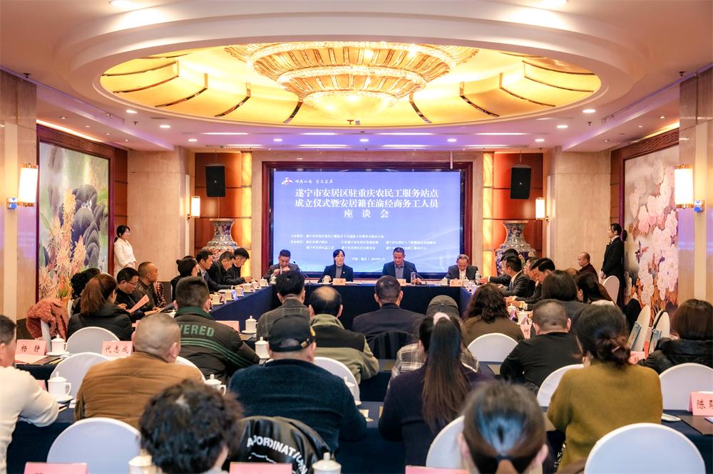 当天,中共遂宁市安居区在渝农民工服务管理支部委员会、安居籍在渝务工妇女联合会、安居区总工会在渝农民工服务站同步成立。在重庆的50余名安居籍优秀农民工代表参加座谈会。优秀农民工代表、农民工党员代表、农民工企业家代表进行了发言,讲述了自己在外的创业和务工经历,交流了各自的心路历程,表达了对家乡的深厚感情,并对家乡的未来发展积极建言献策。