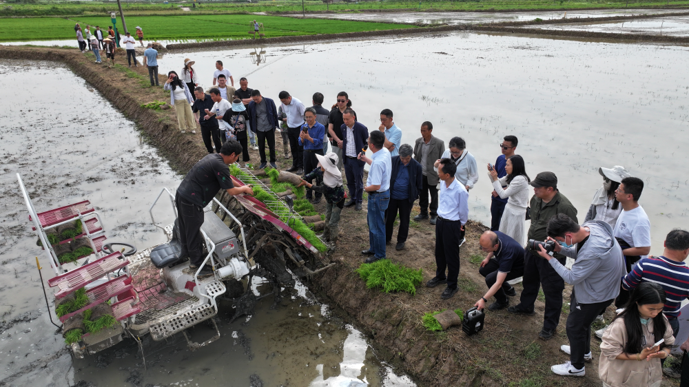 不同于以往的室内学习,此次培训将课堂搬至了农业生产一线。当天,与会人员先后来到三家镇高石村安叁育秧中心、河嘴村水稻千亩高产展示片,观摩水稻育秧培苗全过程自动化、智能化以及水稻机插秧作业。