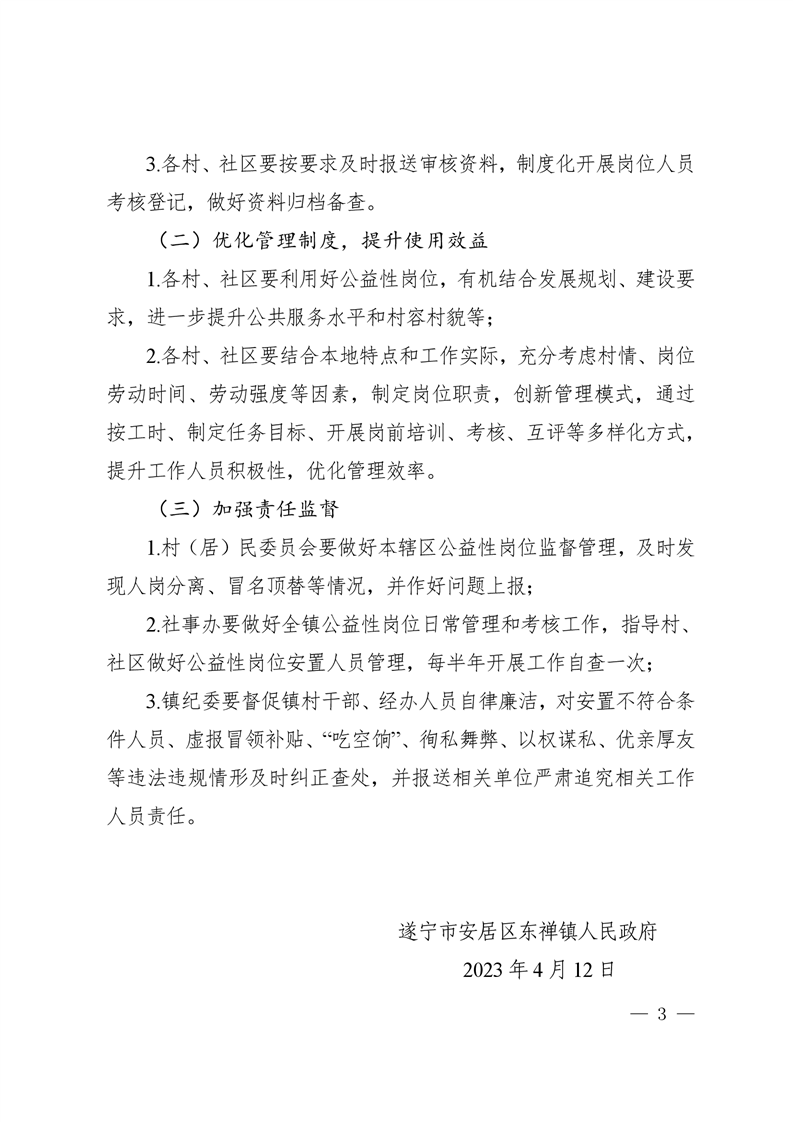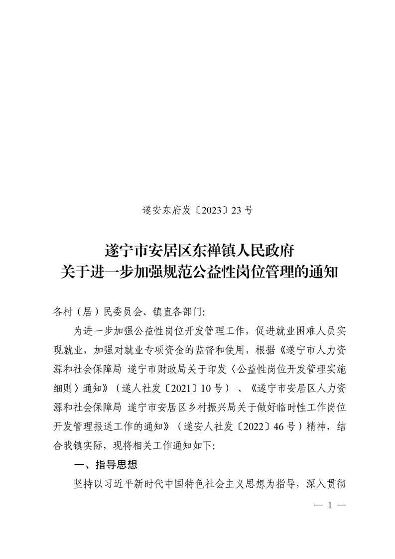遂宁市安居区东禅镇人民政府关于进一步加强规范公益性岗位管理的通知