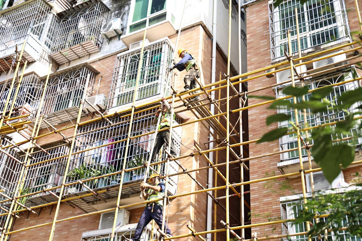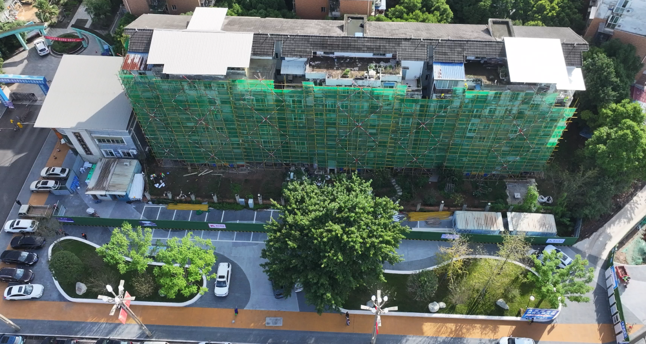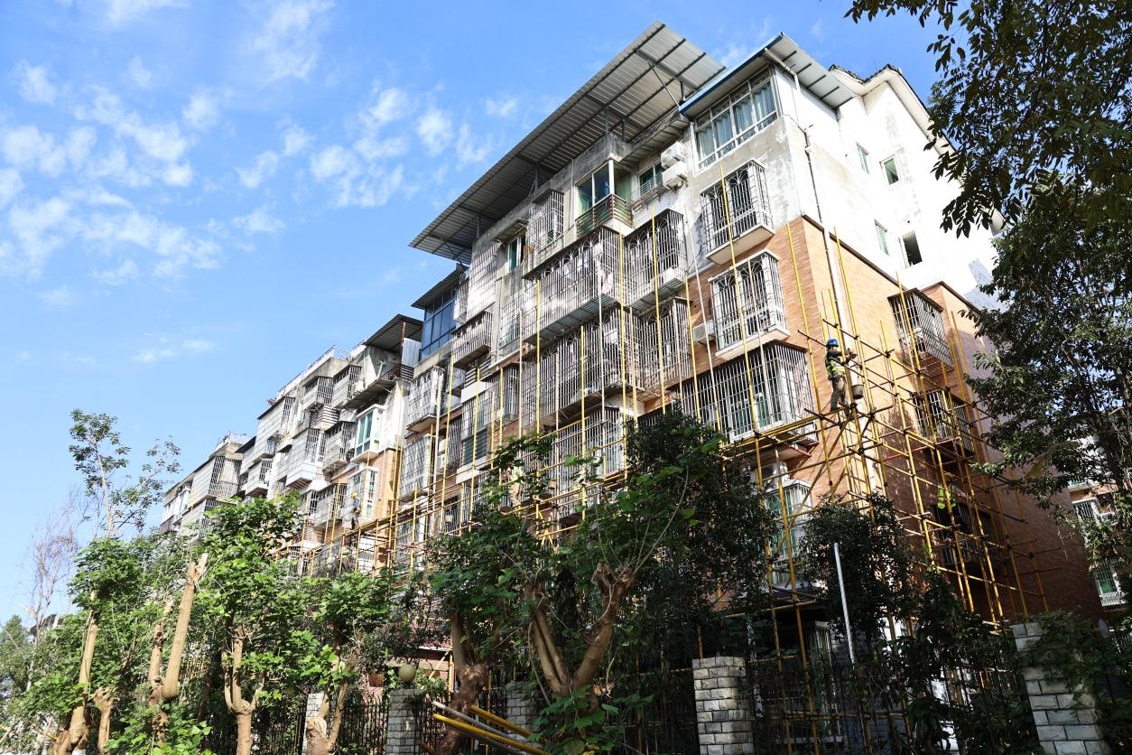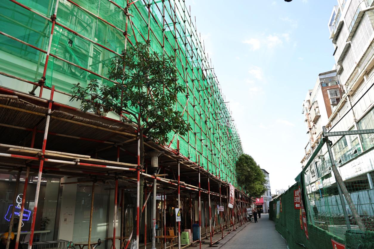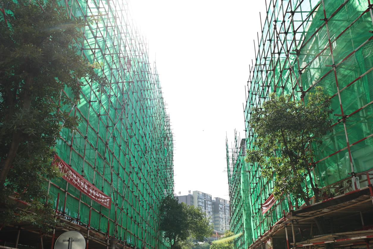 与此同时,位于凤凰街道的水木青华老旧小区改造项目现场,30余名工人正有序地搭建脚手架、围绿网,为老楼“换新装”做前期工作。