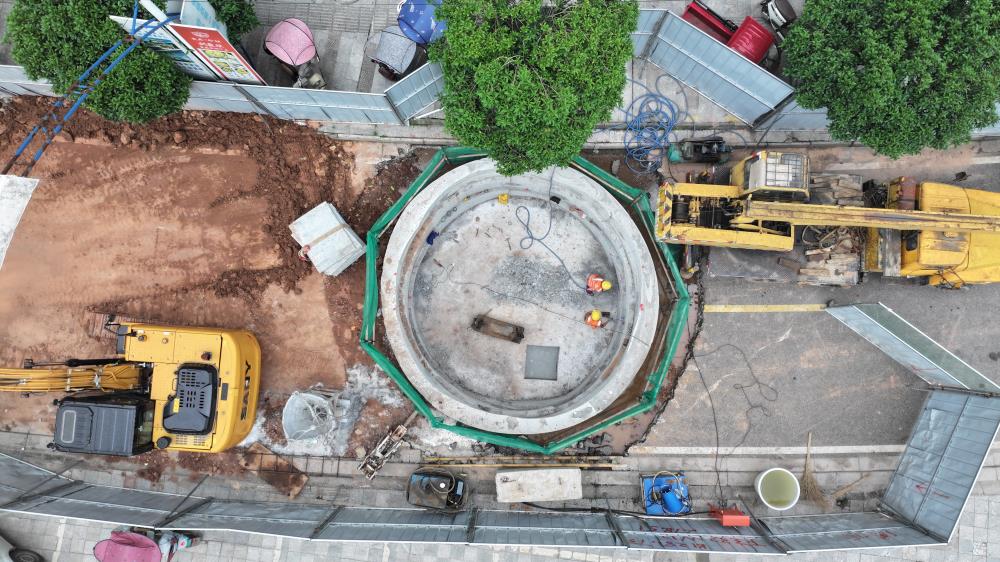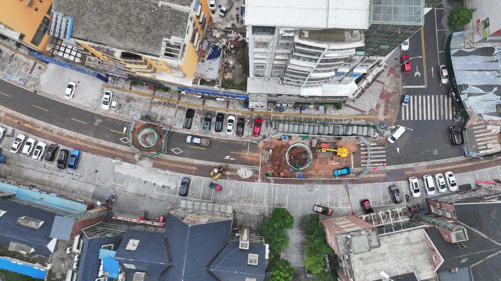 值得一提的是,项目主体位于城区,为最大限度减少对商铺、车辆及行人出行的影响,项目针对性地采用了地下顶管施工工艺。杨小东介绍:“地下顶管施工是一种非开挖或少开挖的管道安装技术,施工时先在地面开挖工作井与接收井,然后利用井内的顶进设备产生的强大顶力,克服管道与土体的摩擦力,将管道逐节顶入土层,完成管道安装,同时将挖掘出的土方运出。”
