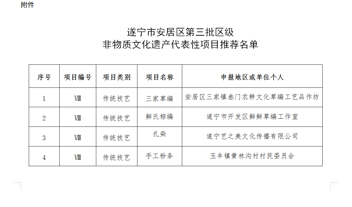 为认真贯彻落实《中华人民共和国非物质文化遗产法》和《四川省非物质文化遗产条例》文件精神,积极开展非物质文化遗产保护工作。我区组织开展了第三批区级非物质文化遗产代表性项目的申报工作。在各镇(街道)和区直相关单位推荐的基础上,经专家对申报项目进行评审,鲜氏棕编等4个非物质文化遗产项目达到区级非物质文化遗产项目要求,拟确定为遂宁市安居区第三批区级非物质文化遗产代表性项目,现予公示。公示期为5天(2023年3月2日-3月6日),若对公示项目有异议,可通过电话(0825-8667080)反映。
