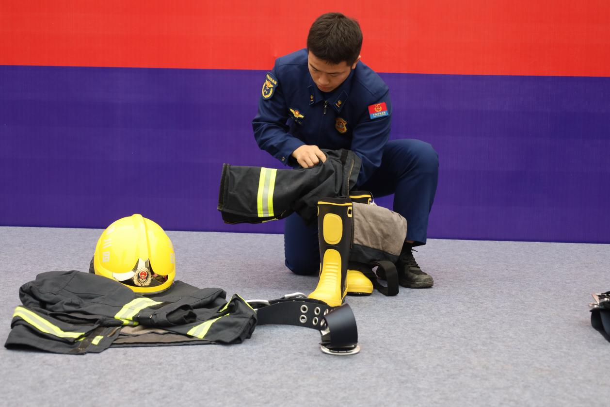仪式现场设置了消防知识有奖竞答、消防技能比赛等多项互动环节。在技能比赛中,参赛人员分组完成了原地着灭火防护服、一人一盘水带连接、灭火器灭火操等实操项目,展现了扎实的消防技能与应急处置能力,进一步提升了公众的消防安全意识。