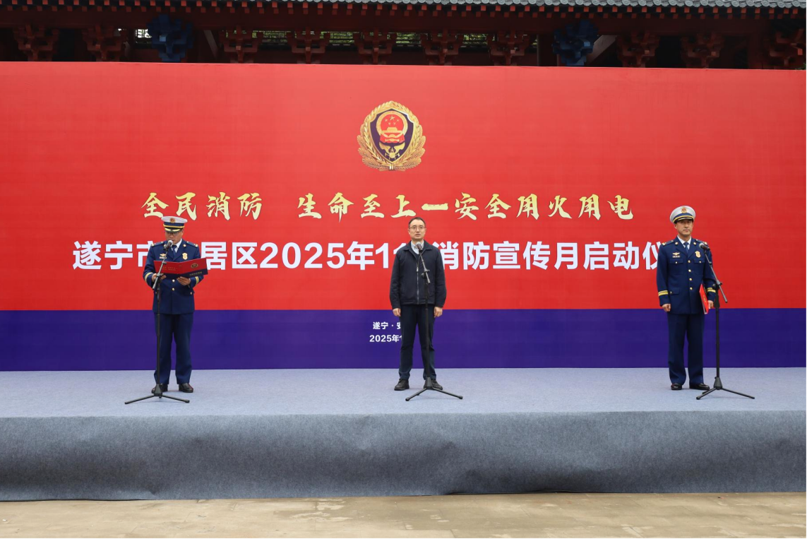 11月6日下午,安居区2025年“119”消防宣传月启动仪式在头陀寺广场举行。区委常委、副区长蒲世超出席仪式并讲话。