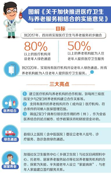 四川出台《加快推进医疗卫生与养老服务相结合的实施意见》到2017年,80%以上医疗机构开设老年人就医绿色通道