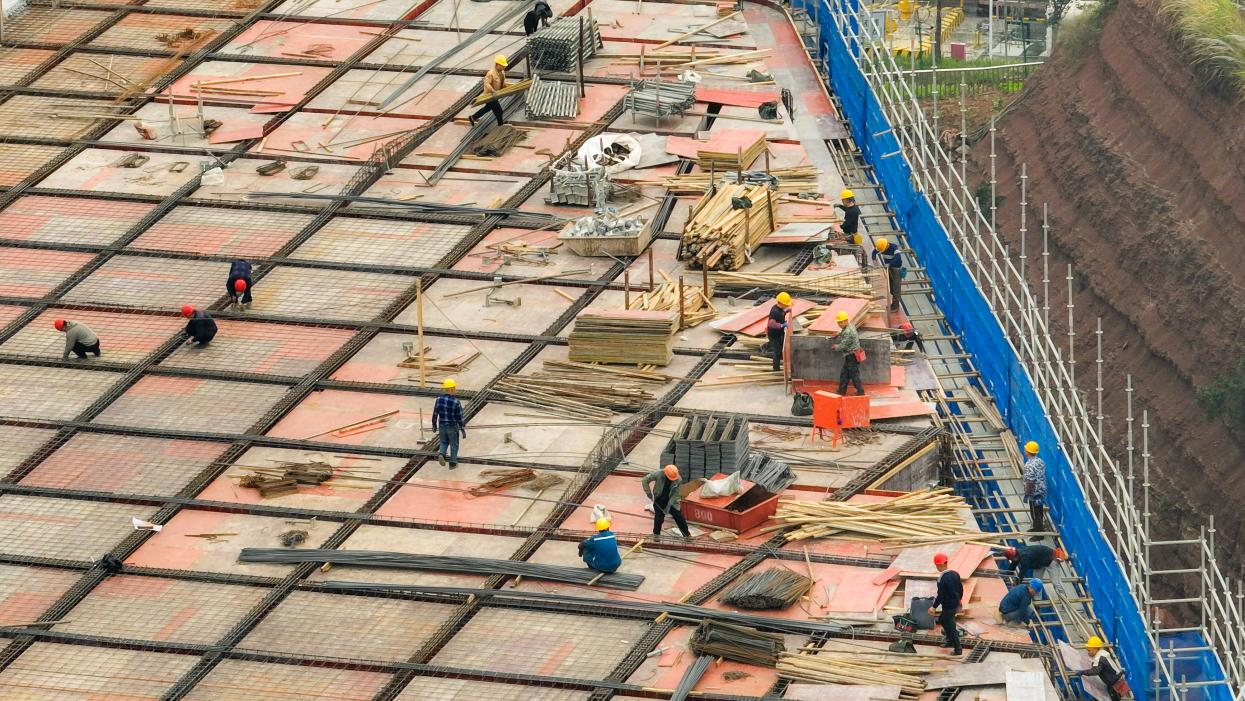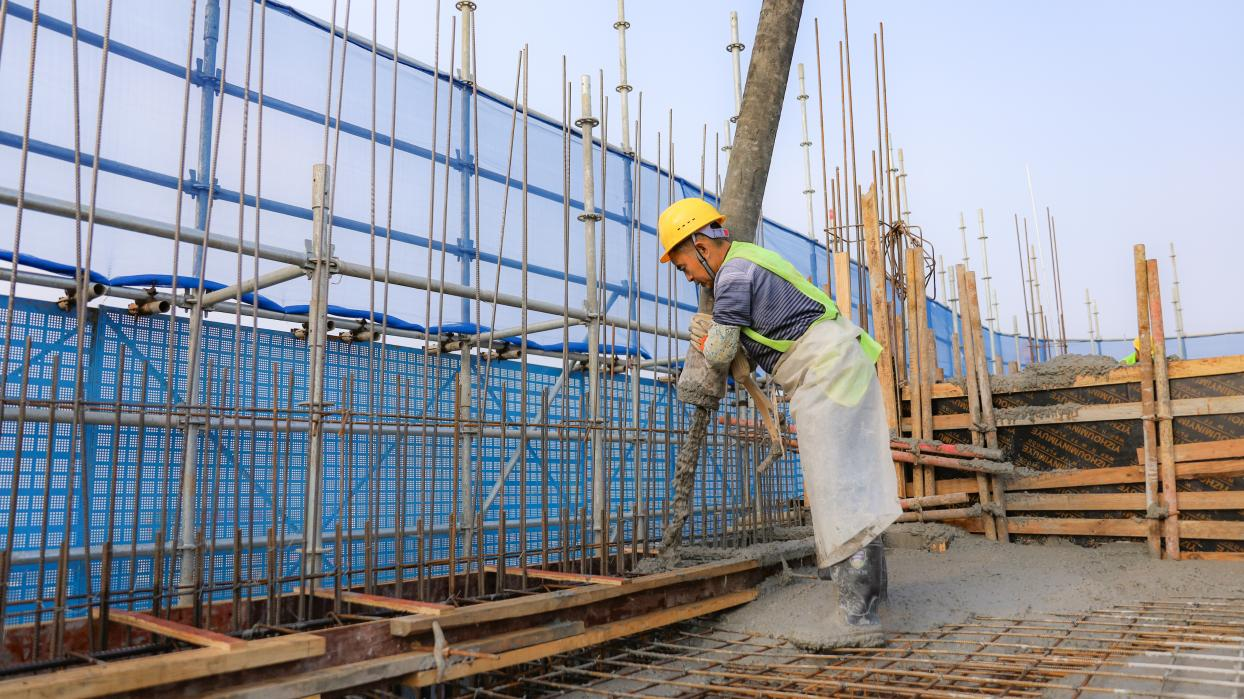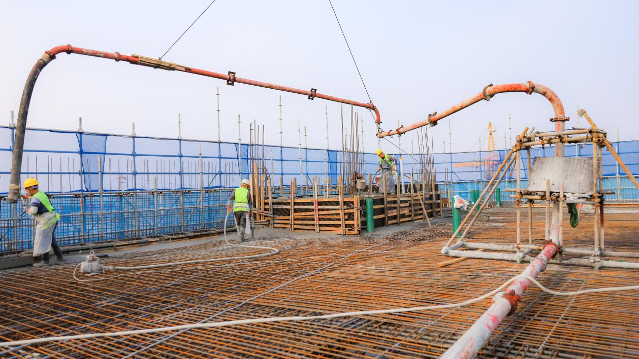 在综合调度中心的第九层,施工正迎来关键节点。钢筋纵横之间,工人们紧密配合着浇筑机械,进行楼板的混凝土浇筑作业,全力冲刺本层封顶目标。