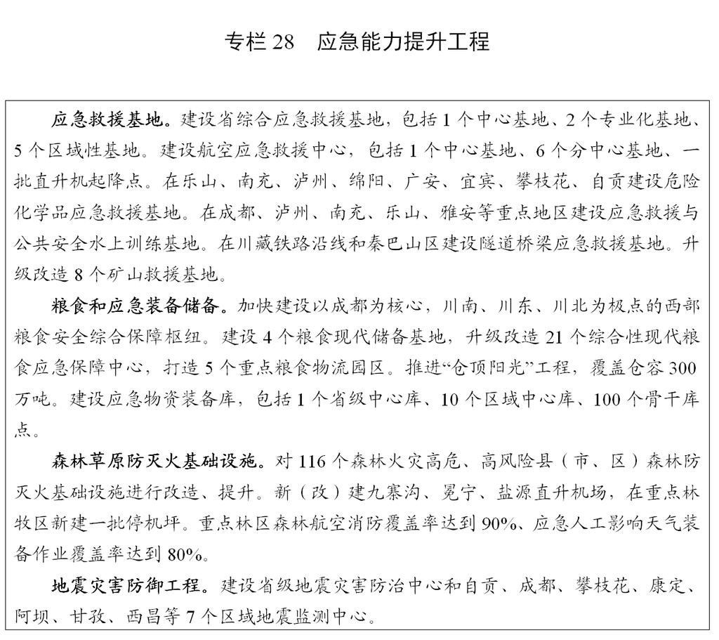 健全应急指挥体系,强化应急通信保障,完善救援现场应急处置工作机制。健全应急力量体系,推进应急救援队伍标准化,建设专业应急救援基地,推进国家西南区域应急救援中心建设,支持引导社会力量参与应急救援。加强应急物资产能保障,健全救灾物资储备网络体系,在重点风险区域布局建设综合应急物资装备储备库(点)。健全应急预案,加强应急演练。