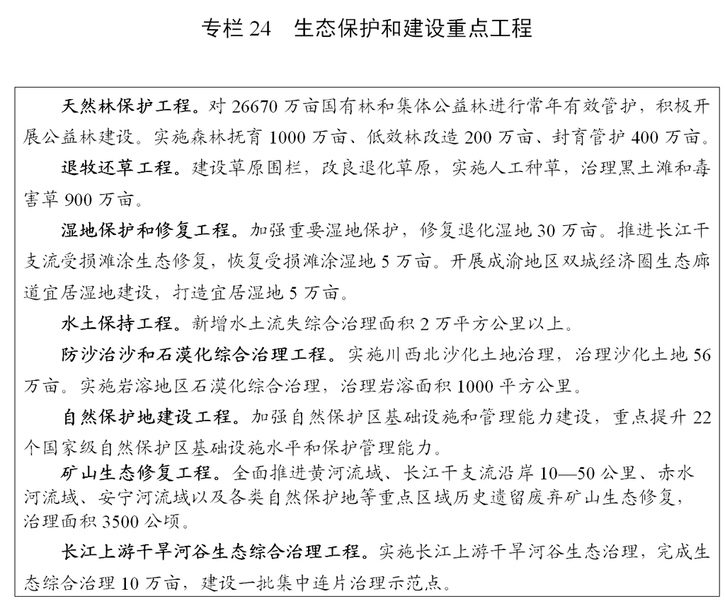加强山水林田湖草系统治理,统筹实施青藏高原生态屏障区生态保护和修复、长江重点生态区(含川滇生态屏障)生态保护和修复、自然保护地建设及野生动植物保护、生态保护和修复支撑体系建设等国家重大生态工程。深入开展国土绿化行动,持续推进高原牧区减畜计划和退化草原生态保护修复,继续实施天然林保护等重点生态建设工程,科学推进荒漠化、石漠化、水土流失综合治理,有效保护修复自然生态系统。推进历史遗留废弃矿山生态修复。
