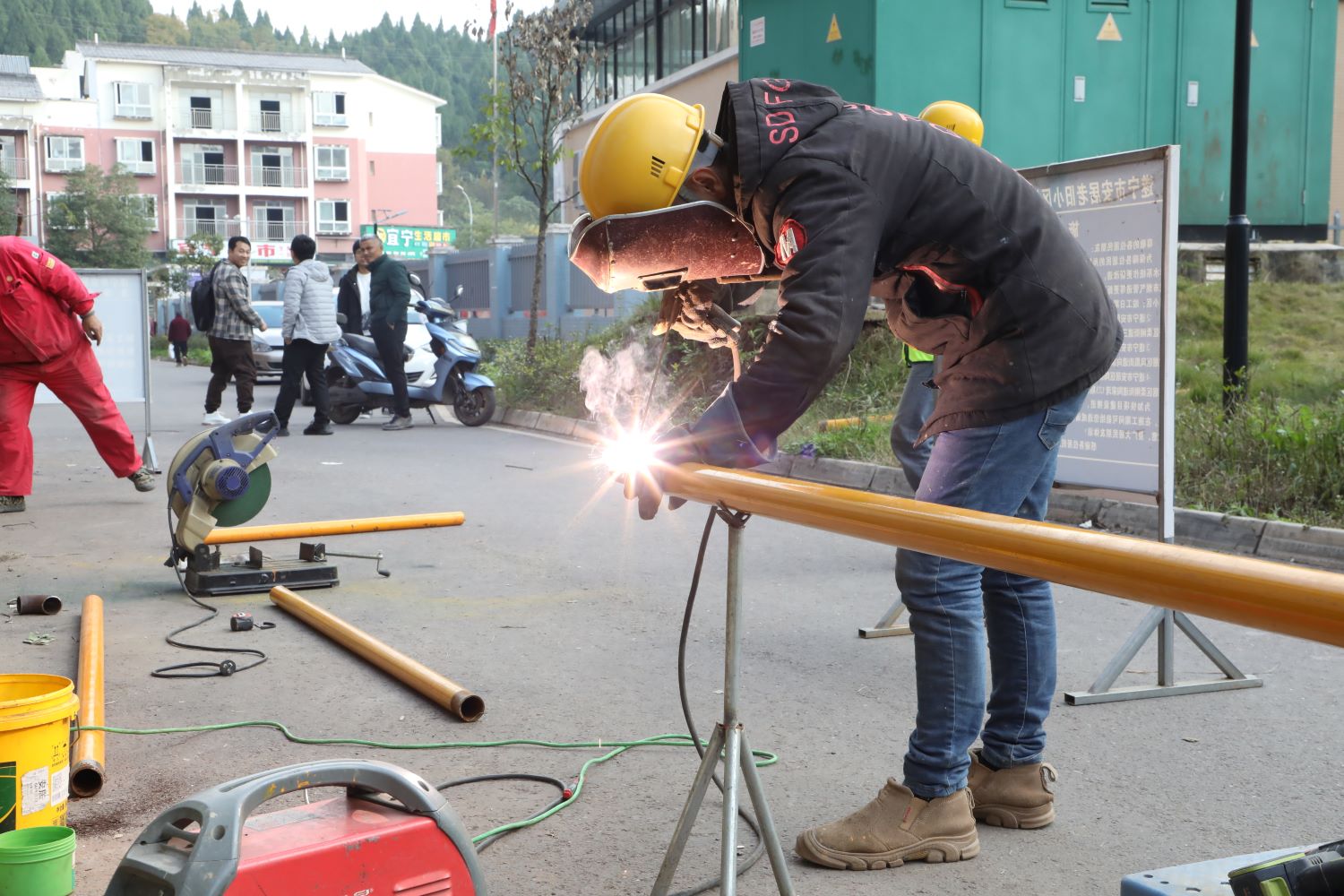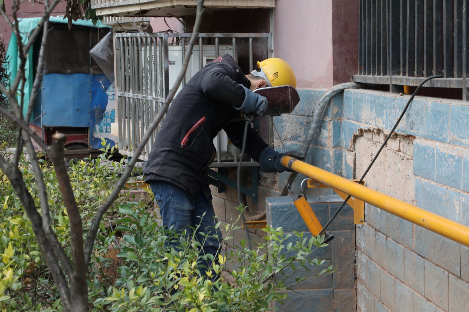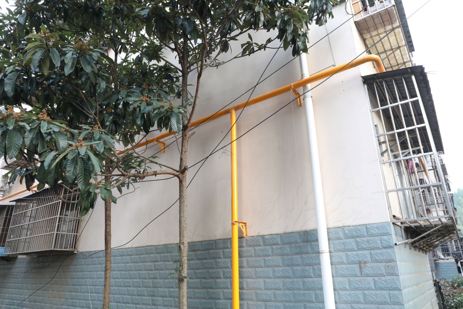 走进陶家湾安置小区,记者看到灰白的居民楼墙体上多出了一抹亮丽的橙黄色,那是崭新的燃气管道“爬”上了居民楼。楼下,工人们正忙着测量墙体、切割材料、打磨零件,为更换燃气管网、设置燃气警示桩、安装燃气报警器做着准备。