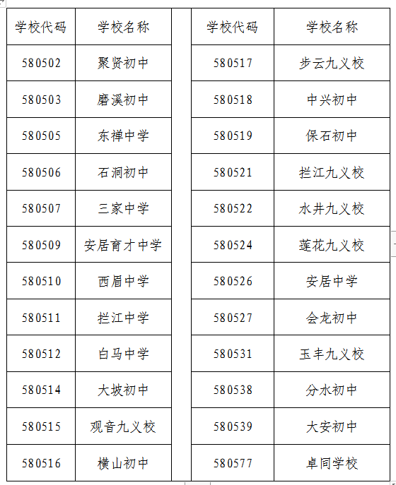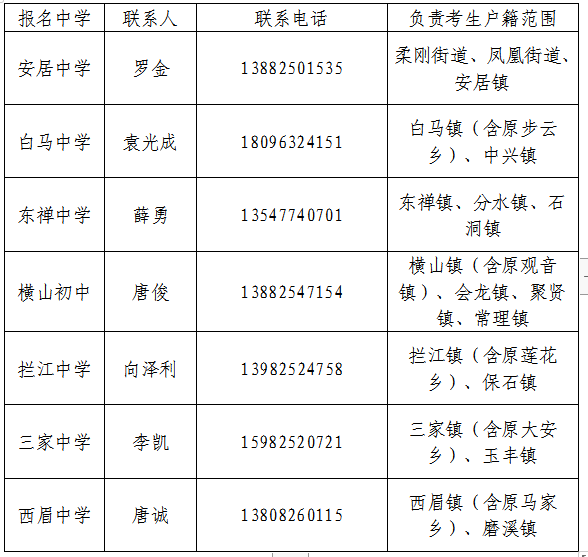 2024年安居区所有应届初中毕业生都要参加中考。区外户籍在安居就读的应届初中毕业生、区内户籍在市外就读的应届初中毕业生、区内户籍的往届初中毕业生(以下简称社会考生)均可报名参加全市组织的中考,享受同等待遇。