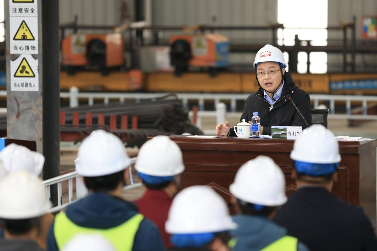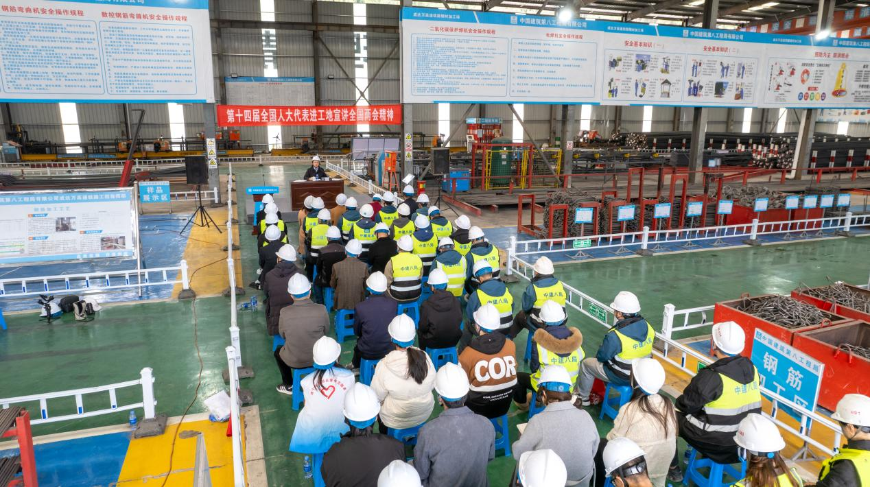 3月12日午后,位于安居区横山镇的中建八局成达万高铁制梁场内,一场别开生面的“午间课堂”分外热闹。70余名安居区高校学生代表、劳模工匠、高铁建设一线党员及青年建设者齐聚厂房,聆听刚刚返遂的第十四届全国人大代表、四川职业技术学院教授唐利军带来的全国两会精神宣讲,现场学习氛围浓厚。