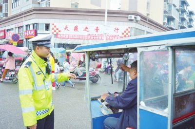 “大姐,这儿不能停车,接送学生的话请停在规定地方。”在梧桐路小学,区交警大队的执勤交警正在对一名乱停乱放的学生家长进行劝导。