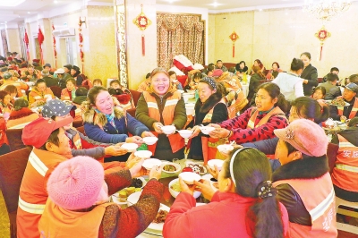 表彰结束后,一场精彩的文化盛宴吸引了环卫工人的眼球,热情的歌舞、诙谐的小品,现场欢呼声不断,其乐融融。会后,爱心企业月亮湾股份有限公司,宴请360余名环卫工人一起在春节前夕共度温暖的时刻。