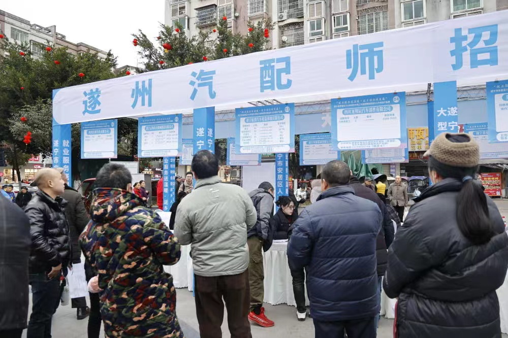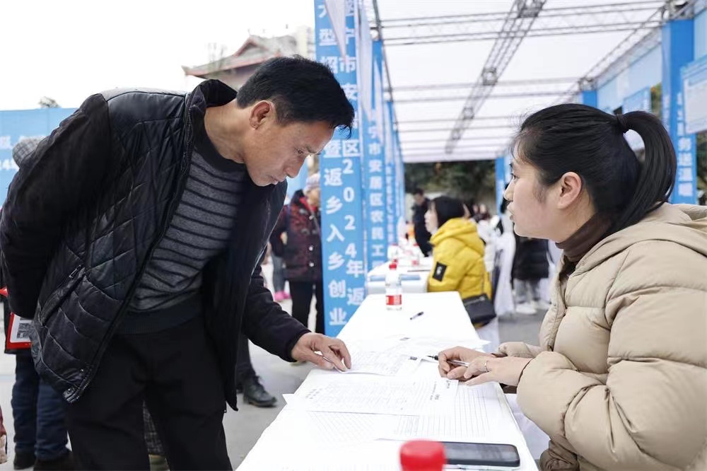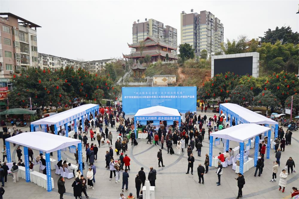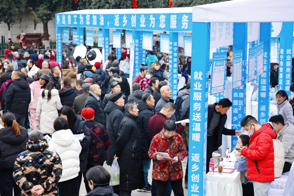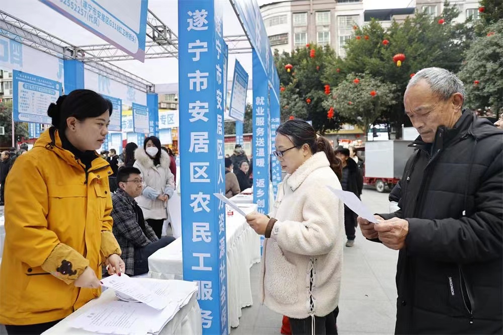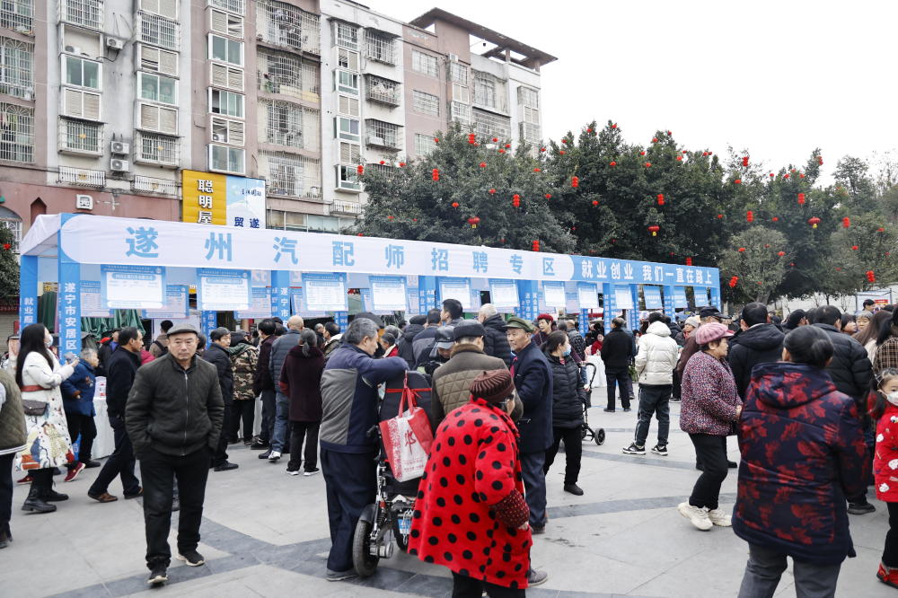 1月18日,由安居区人力资源和社会保障局、区农民工服务中心等主办的2024年返乡农民工大型招聘会暨返乡入乡创业产品展在头陀寺广场举行。