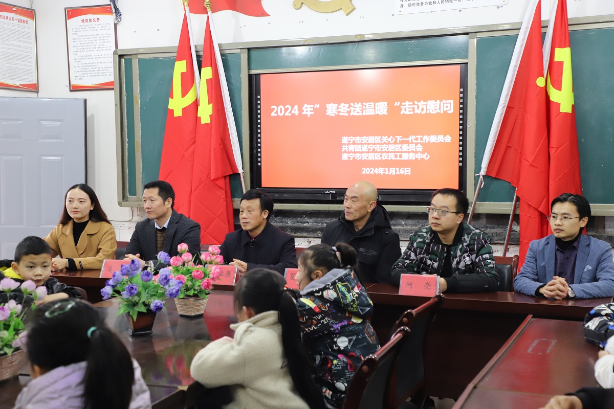 活动现场,安居区关工委、团区委相关负责人等为40名留守儿童、困境学生发放学习用具、防寒衣物等慰问品,并亲切与孩子们交流,关心他们的学习生活情况,鼓励孩子们从小树立远大理想,努力学习,积极进取,争做共产主义事业的优秀接班人。