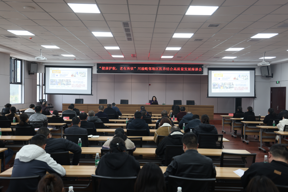 当天下午,川渝毗邻地区医养结合高质量发展座谈会召开,邀请成都市第八人民医院党委书记陈芍就推进医养结合工作作主题讲座,川渝毗邻地区医疗单位、安居区医疗卫生单位就医养结合工作进行了研讨交流。