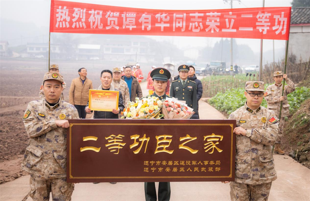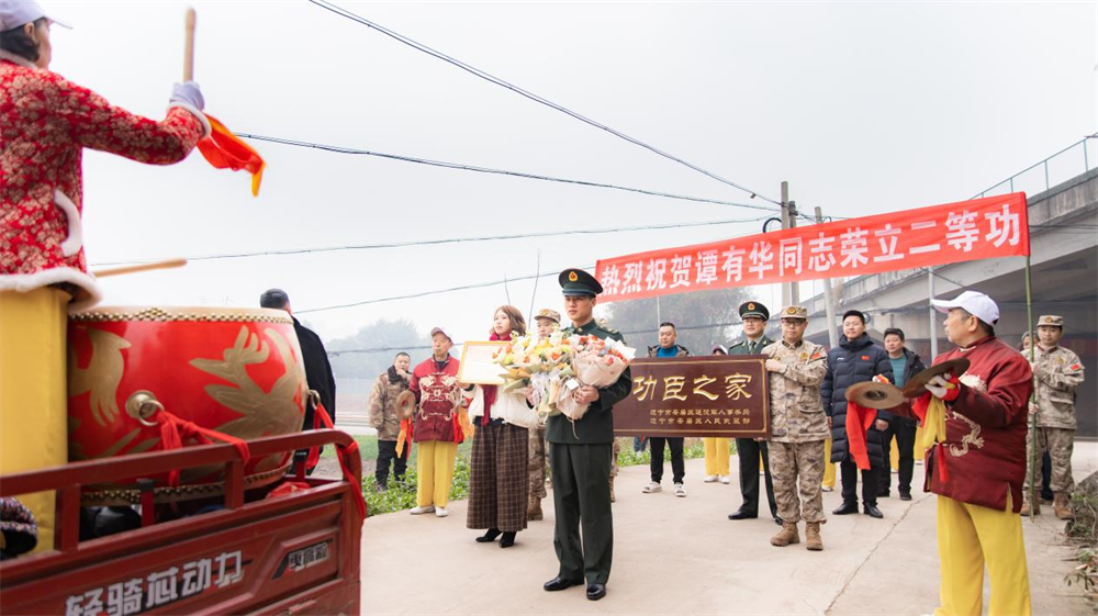 送喜报现场,横幅招展,锣鼓喧天,热闹非凡。送喜报队伍一路敲锣打鼓将喜报送到谭有华家中,沿途的乡亲们纷纷驻足称赞,军地领导为谭有华家属佩戴“一人立功、全家光荣”的绶带,送上“二等功臣之家”牌匾,并将喜报、鲜花和慰问金送到他们手中。