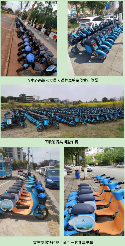一是开展全面摸排,回收问题车辆。目前安居共有1500辆共享单车,设有254个停放点位,共占地约2600㎡。针对共享单车体量大,为加强管理,我局积极联系遂宁骑安网络科技有限公司安居片区负责人,要求进行全面巡检,回收问题车辆,确保市民出行安全。二是完善程序资料,完成更新换代。指导遂宁骑安网络科技有限公司积极准备新车的审批资料,完成质量、运营等相关审批,加快车辆的更新换代,既要体现安居特色,也要确保市民群众的出行需求,更要保证出行安全。三是合理规范点位,强化常态管理。在五中心两馆、中央商城区、经开工业区、黄峨酒店、永正酒店、安居人民医院、学校等重点场所附件设置点位,保障用车辆,为市民出行提供便利。增设巡检人员,对各个路段进行常规巡检,规范点位停放,确保市容秩序。四是强化主体责任,加强执法监督。发挥网格作用,加强网格区域监督管理,发现问题积极反馈对接,形成管理和执法监督的有机联合。