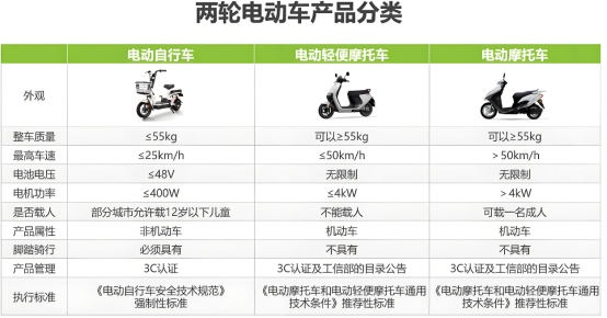 电动自行车是以车载蓄电池作为辅助能源,具有脚踏骑行能力,能实现电助动或/和电驱动功能的两轮自行车。电动自行车产品整车国家已纳入CCC认证管理范畴,电动自行车执行标准为GB 17761-2018《电动自行车安全技术规范》、GB 42295-2022《电动自行车电气安全要求》(2024年1月1日实施)等国家标准。电动自行车与电动轻便摩托车、电动摩托车的区别如下图。