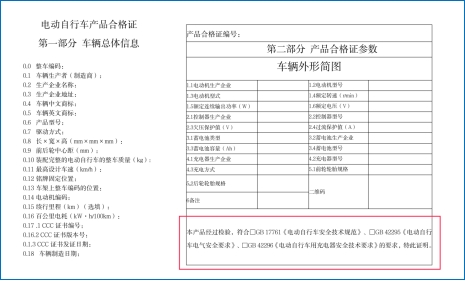 3.查看车辆一致性。根据GB 17761-2018国家标准规定,电动自行车须具有脚踏骑行能力,最高设计车速不超过25公里/小时、整车重量(含电池)不超过55公斤、电机功率不超过400瓦、蓄电池标称电压不超过48伏等。消费者可以根据产品合格证检查与实际车辆一致性,尤其要注意实际购买车辆的蓄电池应当和合格证上蓄电池信息保持一致。