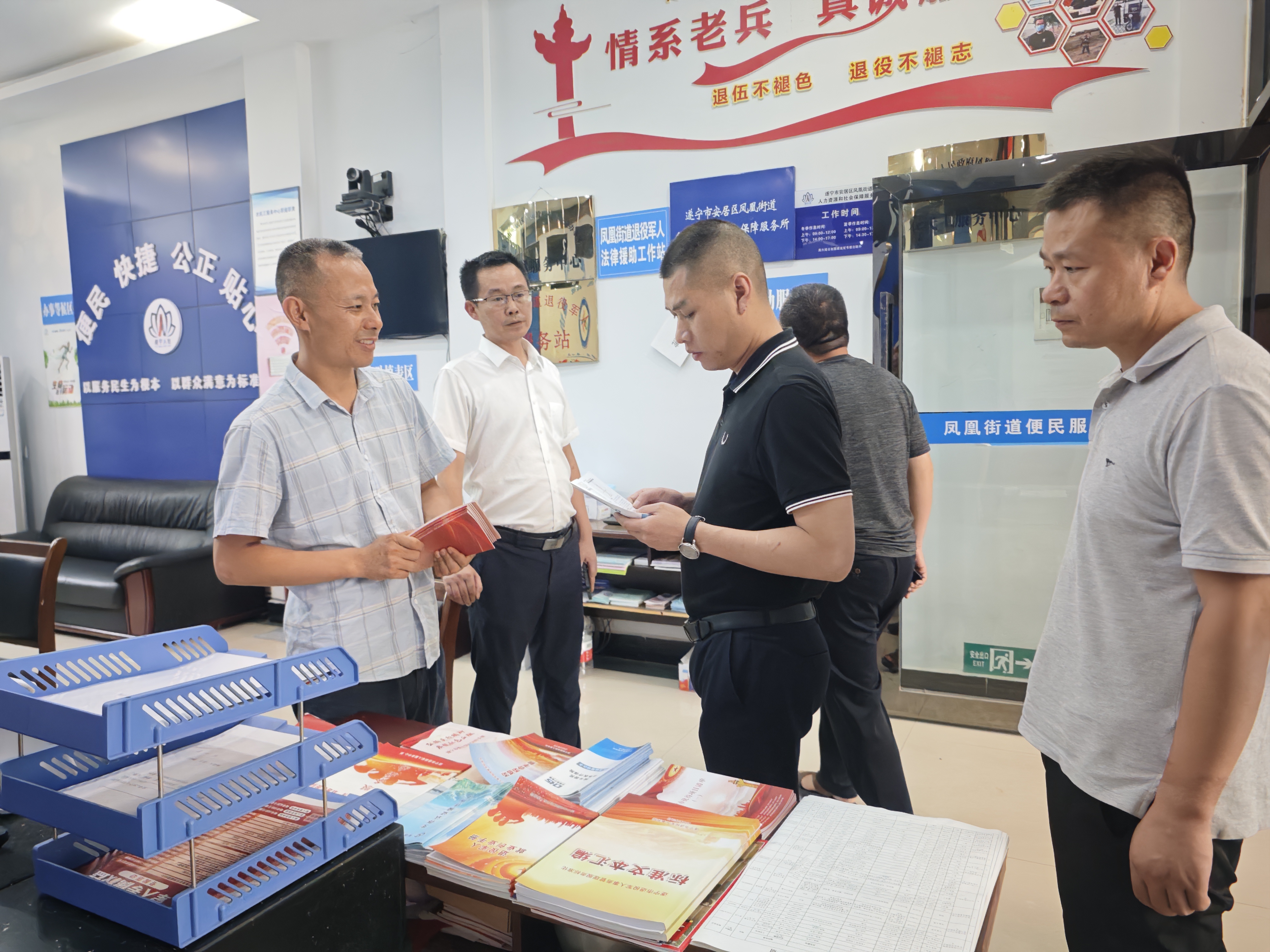 为了着力提升退役军人服务站规范化建设水平,切实增强退役军人的荣誉感、获得感和幸福感。2024年7月9日,市、区退役军人服务中心检查指导凤凰街道退役军人服务站相关工作,并提出了宝贵意见。在了解街道退役军人服务站基本情况后,现场查看了政策宣传、阵地建设、档案资料、日常工作开展及双拥等工作落实情况及形成的台账资料,鼓励我街道继续发扬拥军优属精神,用心用情服务好退役军人。