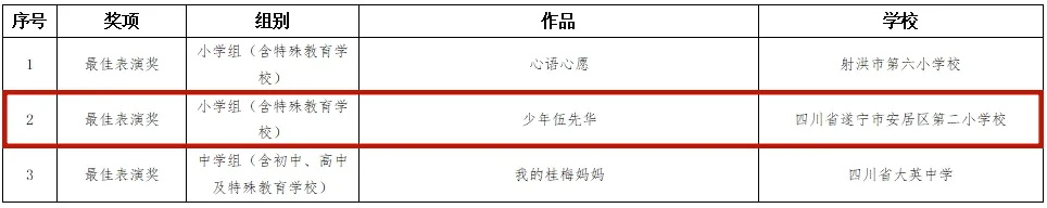 近日,四川省第三届大中小学铸牢中华民族共同体意识校园舞台剧展演活动获奖名单公布,安居斩获小学组二等奖1部、优秀奖1部;最佳表演奖1部。