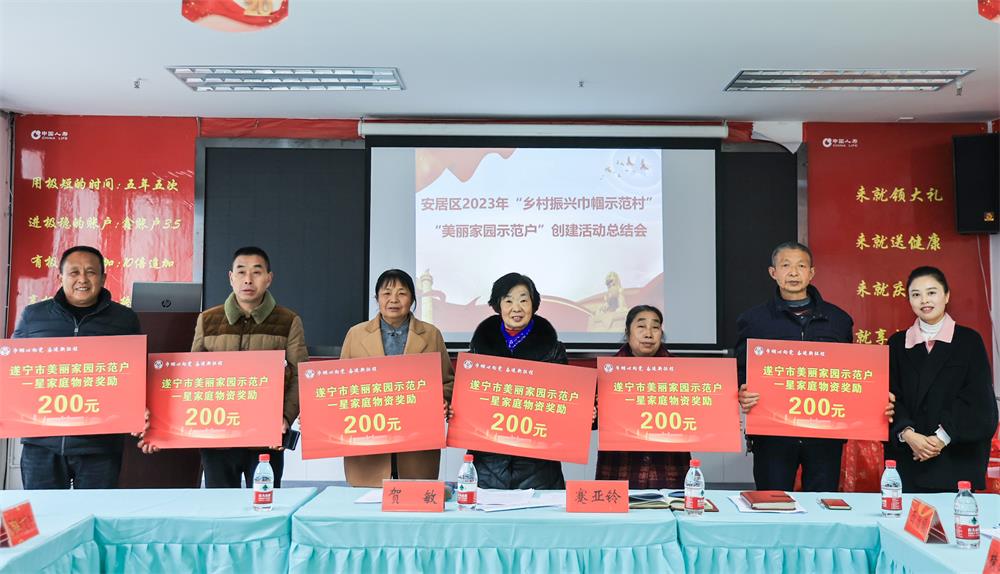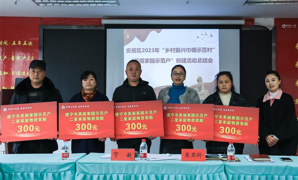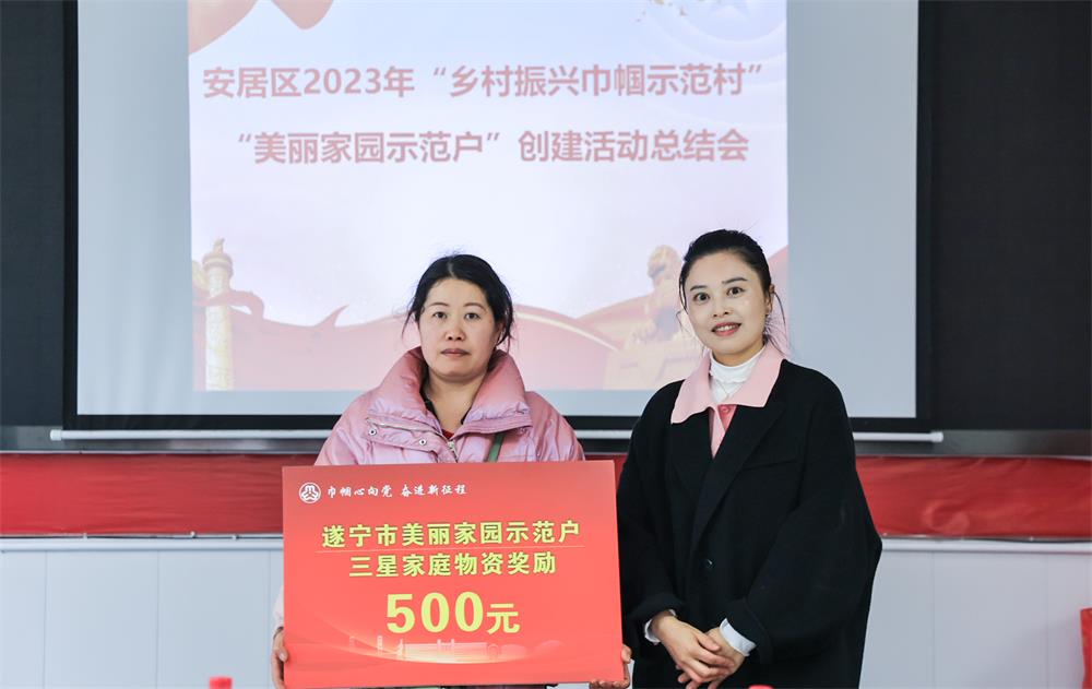 会上,宣读了《安居区美丽家园创建倡议书》,通报了市级“美丽家园示范户”创建结果、区级“美丽家园示范户”创建结果,并为获得市级“乡村振兴巾帼示范村”的3个村进行授牌、为获得市区级“美丽家园示范户”的90户家庭颁发奖牌、奖金及物资。
