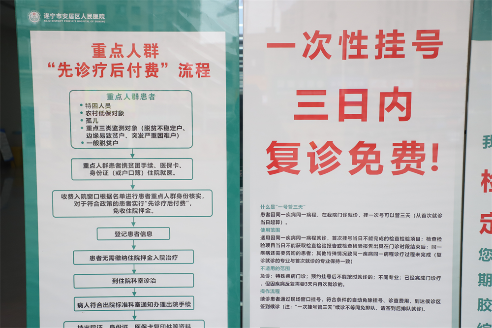 而安居区在便捷就医服务上的探索不止于此,针对七类困难群体,安居区在全区所有公立医院推行了“先诊疗后付费”信用就医制度,切实缓解了他们的住院垫资压力。