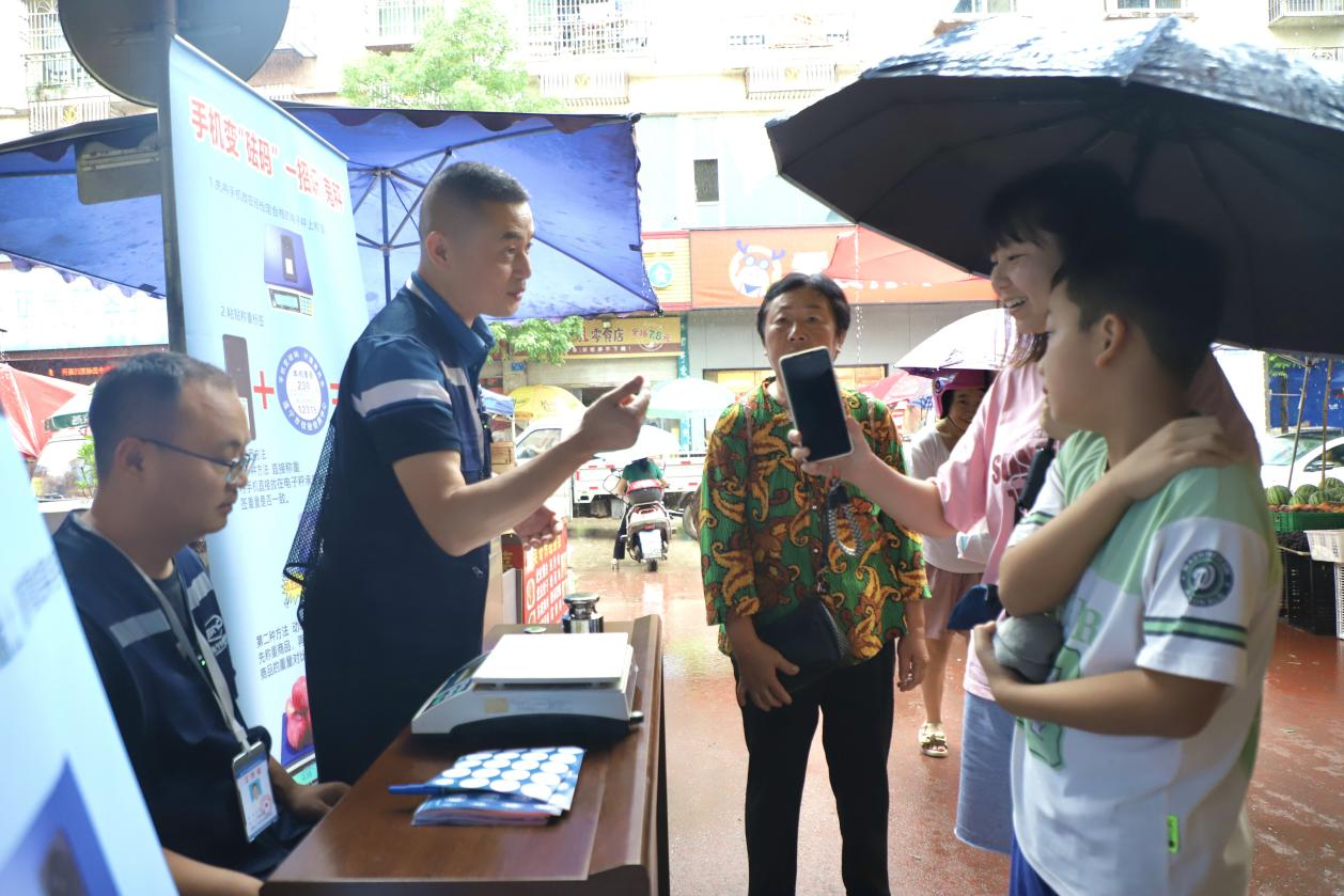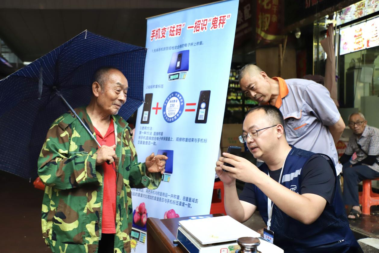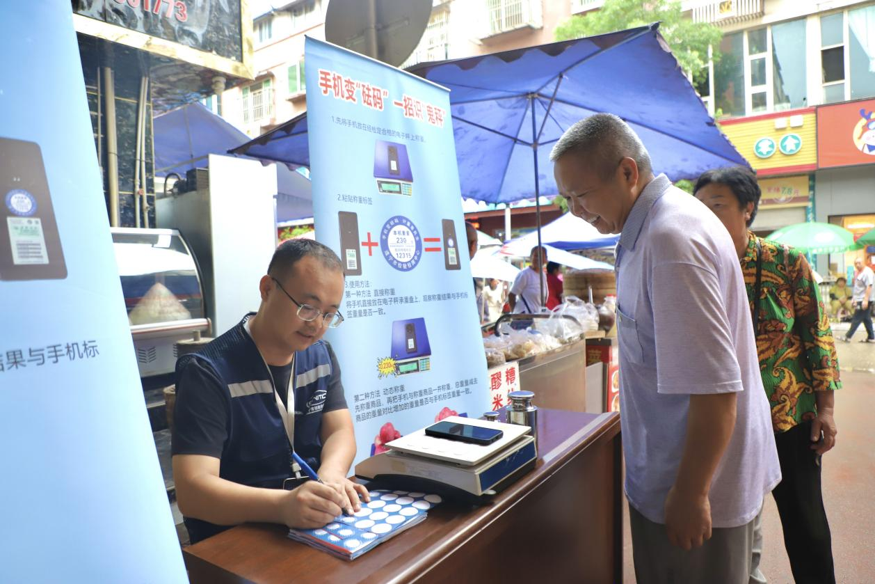 “你的手机净重184克,以后购物称重时,直接用‘手机砝码’检验比对商品重量,就可以知道商家的秤是否合格了。”7月3日,区市场监管局联合遂宁市检验检测中心在安居大市场开展了“手机变砝码,一招识‘鬼秤’”电子计价秤专项整治宣传活动。