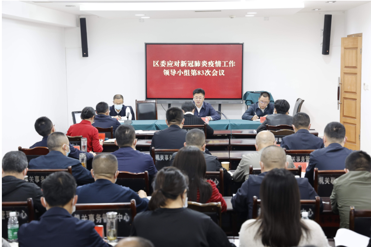 11月11日,区委书记、区委应对新冠肺炎疫情工作领导小组组长吴军主持召开区委应对新冠肺炎疫情工作领导小组第83次会议,传达贯彻全国、全省、全市新冠肺炎疫情防控工作电视电话精神,强调要深入领会习近平总书记关于疫情防控的系列重要指示精神,切实把思想和行动统一到党中央和省委、市委决策部署上来,坚定不移落实“外防输入、内防反弹”总策略和“动态清零”总方针,扎实抓好中央“二十条措施”落地落实,坚守一份情怀、一份担当,坚信安居战“疫”必胜,慎终如始、科学精准落实好各项防控措施,尽最大努力换取最好的成果,以实际行动落实党的二十大精神。区委副书记、区长杨文彬,区委副书记黄杰出席会议。