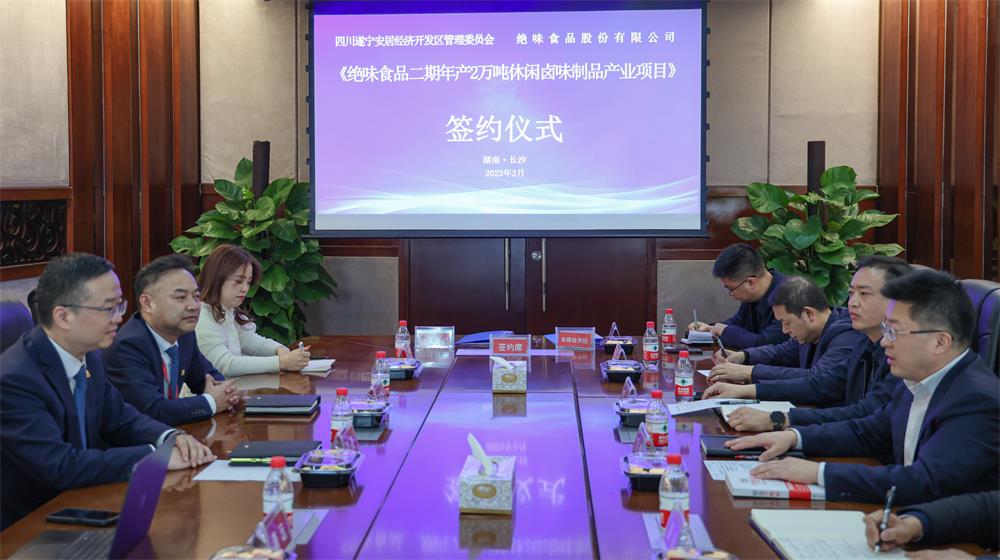 绝味食品股份有限公司副总裁、董事会秘书、投资部总监高远,基建管理部总监王立志,生产管理部总监康人杰以及安居区委常委、区委办主任聂鹏,区委常委、副区长、区委统战部部长、区经合局党组书记杨军以及区经科局、区经合局主要负责同志出席签约仪式。