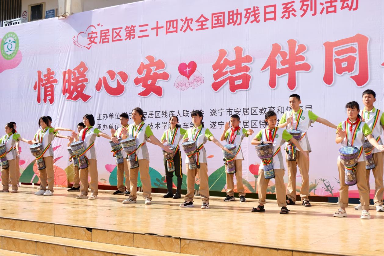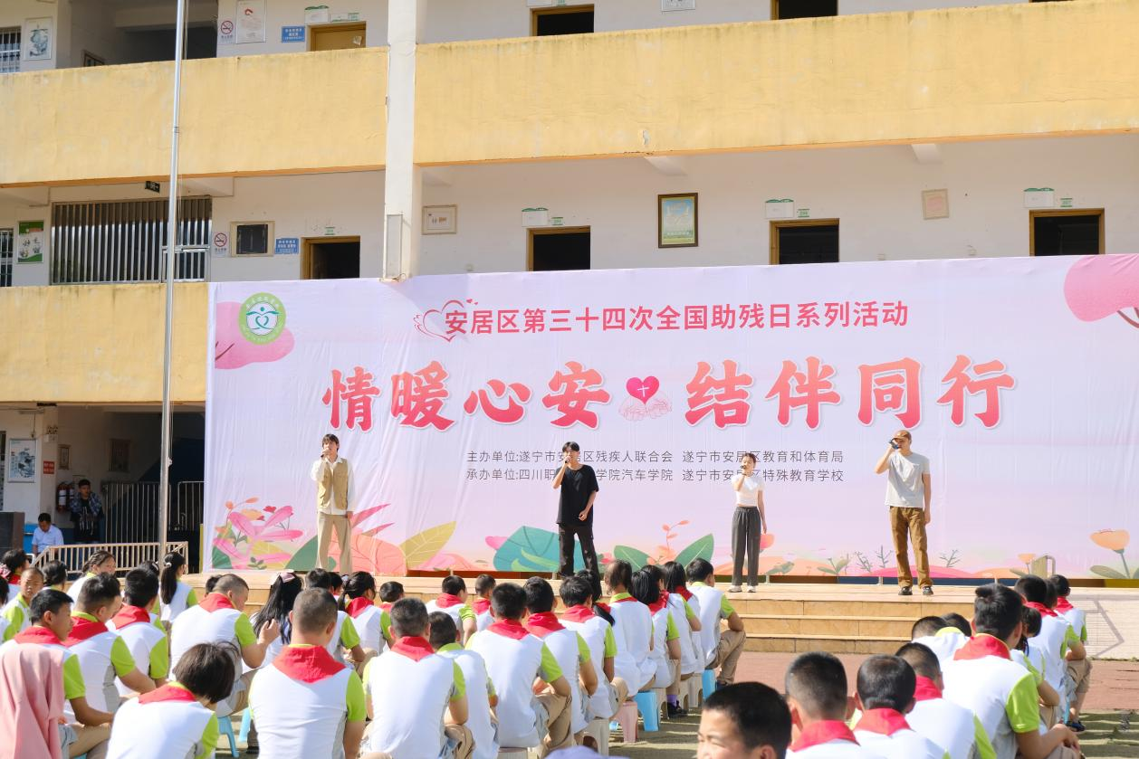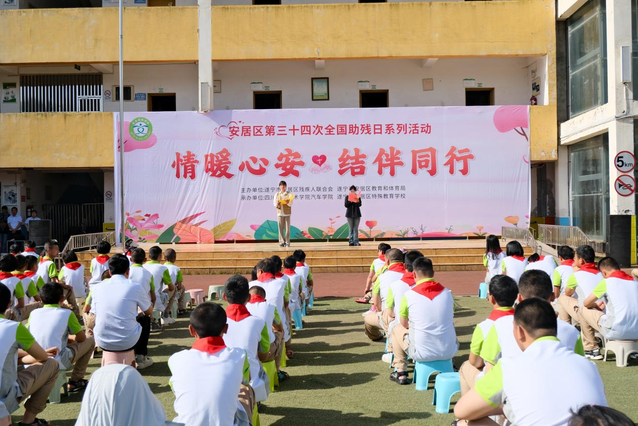 在第34次全国助残日到来之际,5月13日上午9时许,迎着初夏的阳光,安居区特殊教育学校的操场上,安居区第三十四次全国助残日系列活动——“情暖心安 结伴同行”正在开展。