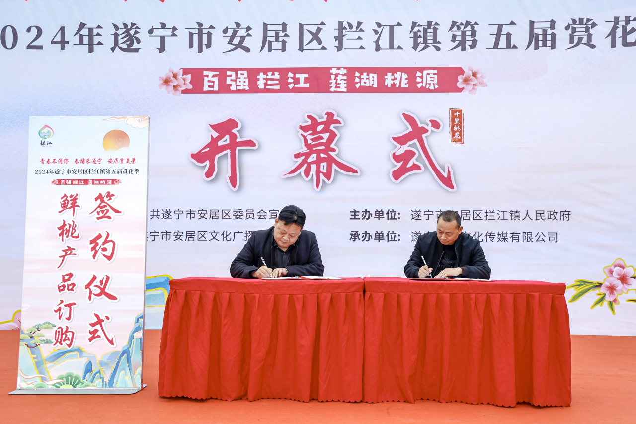 开幕式上,拦江镇与成都寿星果业有限责任公司成功签订鲜桃产品订购协议,进一步巩固了乡村产业发展。同时赏桃花活动和川剧变脸、汉服表演等节目也极大地丰富了村民精神文化生活。