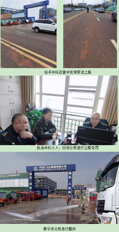 一是针对重点区域,强化日常监管。经开中队对辖区内现有的在建工地等重点区域进行日常巡查,巡查中发现胡琴路存在带泥上路现象。经调查后发现是因为中铁某局有限公司在胡琴路施工,导致车辆带泥污染城市道路。二是针对违法行为,严格“逗硬”查处。经开管理中队联合乡镇和市容执法监察中队对“中铁某局有限公司在胡琴路施工,导致车辆带泥上路污染城市道路”的行为采用执法手段进行立案处罚,并要求及时整改。三是针对三个重点,坚持正向引领。加强对重点区域、重点时段、重点行业的帮扶与指导,按照《中华人民共和国大气污染防治法》的相关要求进行宣传,做好正向引领。