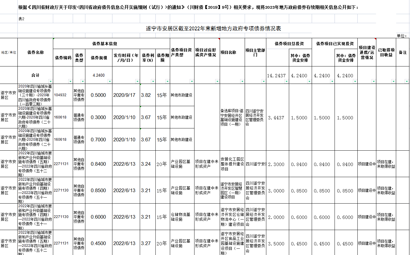 经开区2023年度遂宁市安居区新增地方政府债券存续期信息公开表