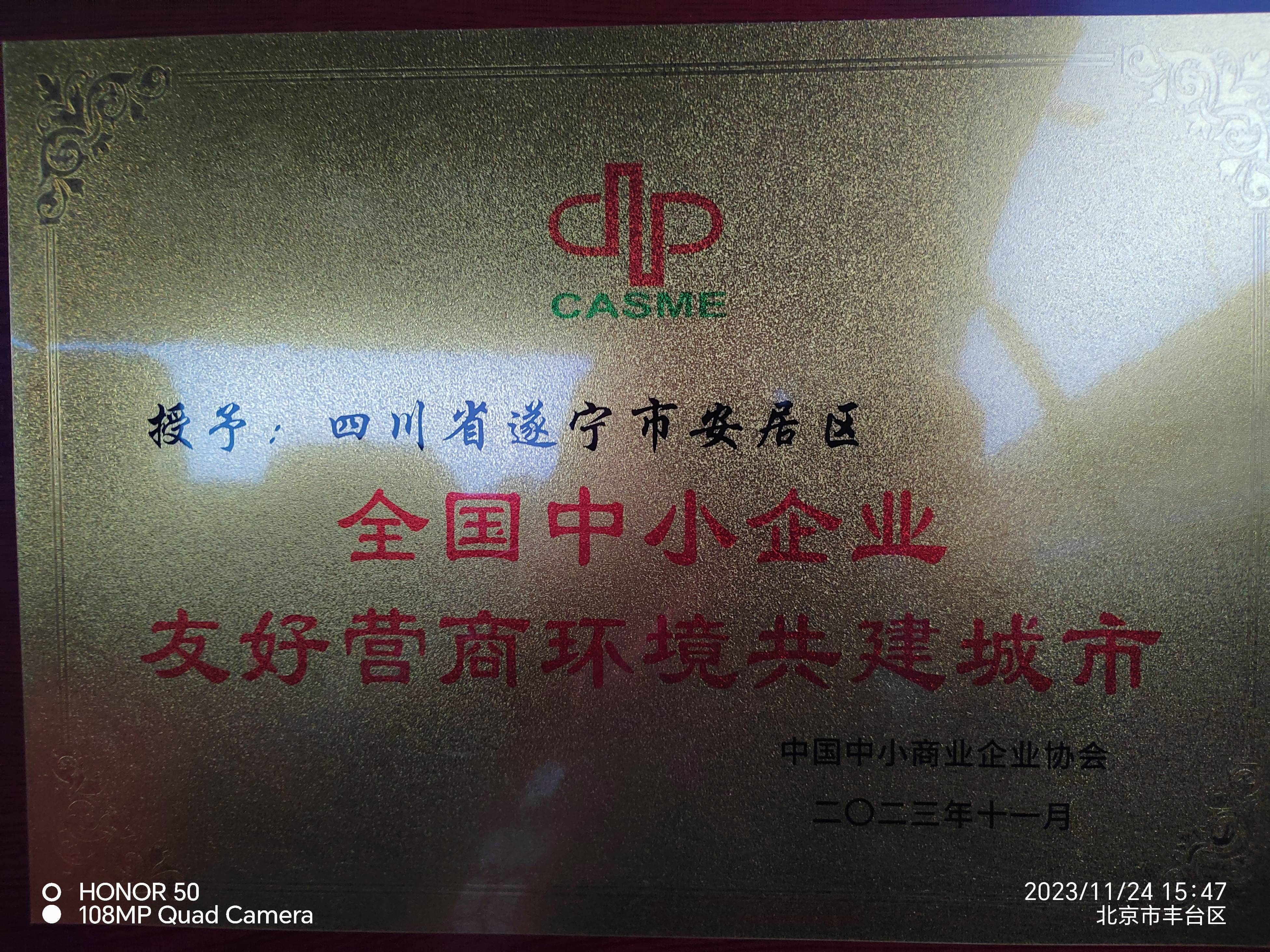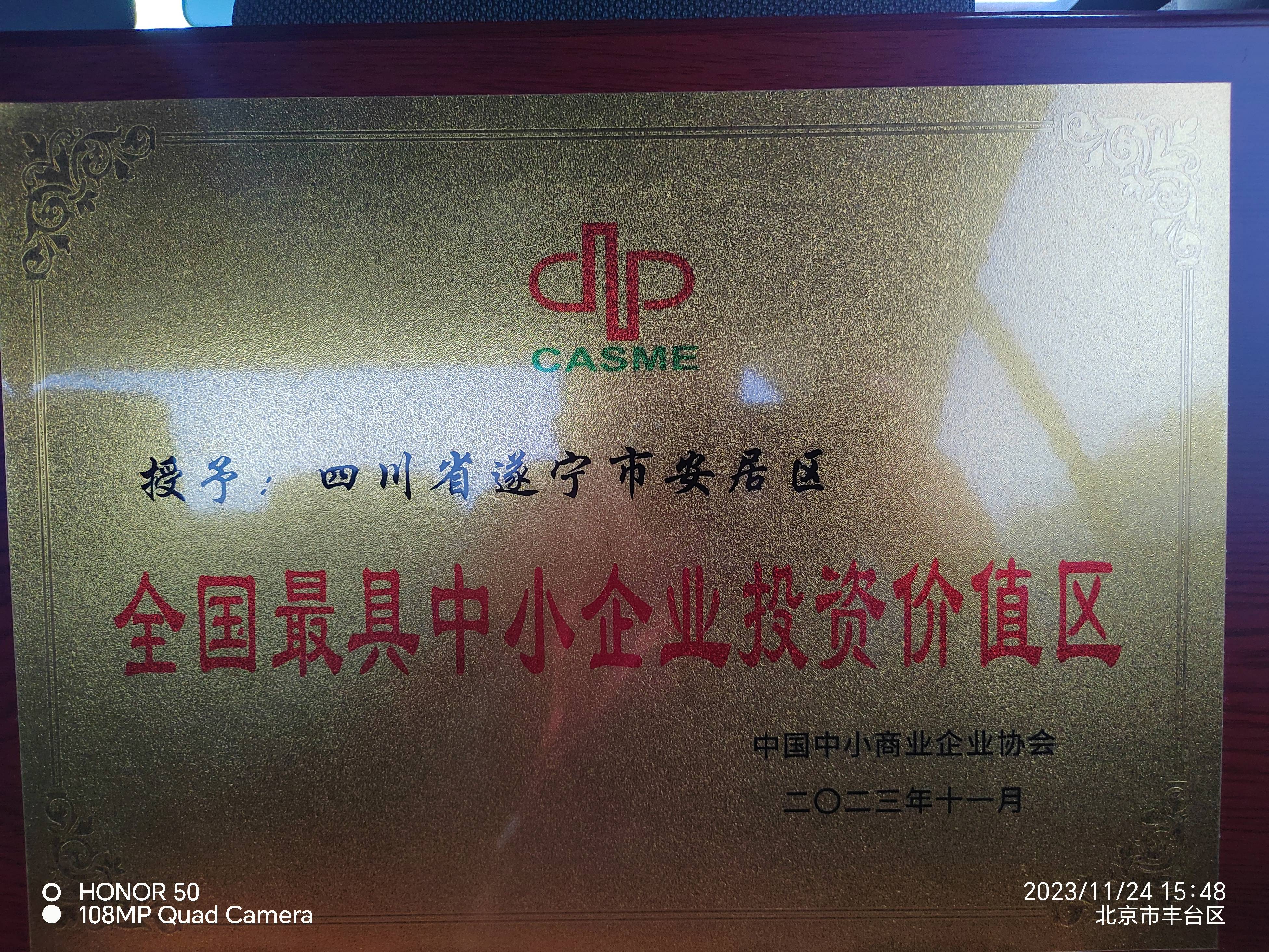 11月24日,在由中国中小商业企业协会主办的“第十八届中国中小企业家年会暨2023招商引资发展论坛”上,四川省遂宁市安居区荣获“全国中小企业友好营商环境共建城市”“全国最具中小企业投资价值区”两项国家级荣誉称号。