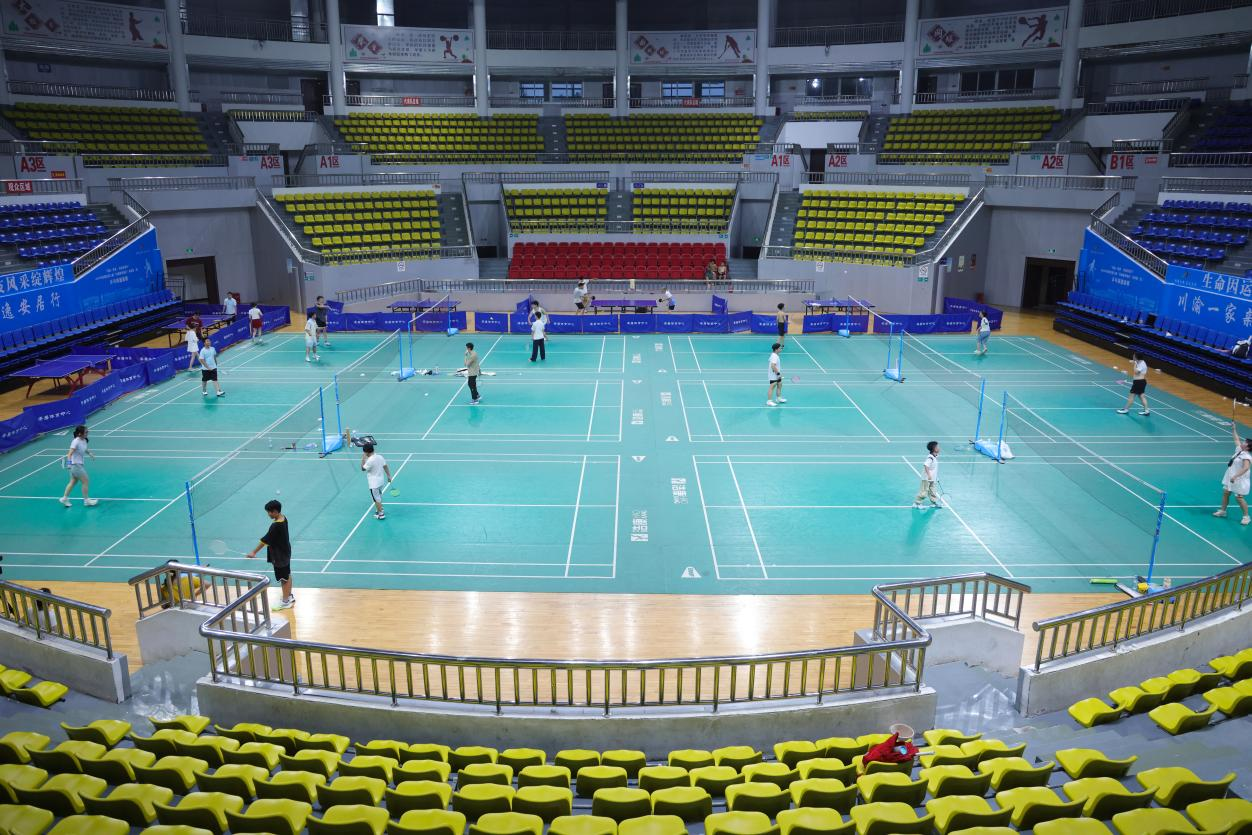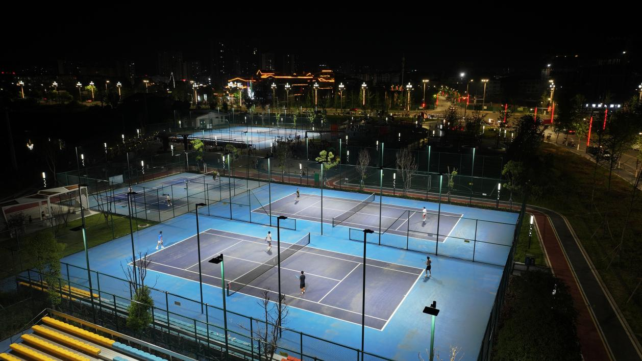 同一时刻,安居区规模最大、设施最全的体育场馆——区体育中心内,同样热火朝天。室内羽毛球、乒乓球场地早已满员,市民们在球场上奔跑跳跃,挥汗如雨,尽情享受着运动的畅快。篮球场、网球场、足球场等室外运动场所也人气十足。