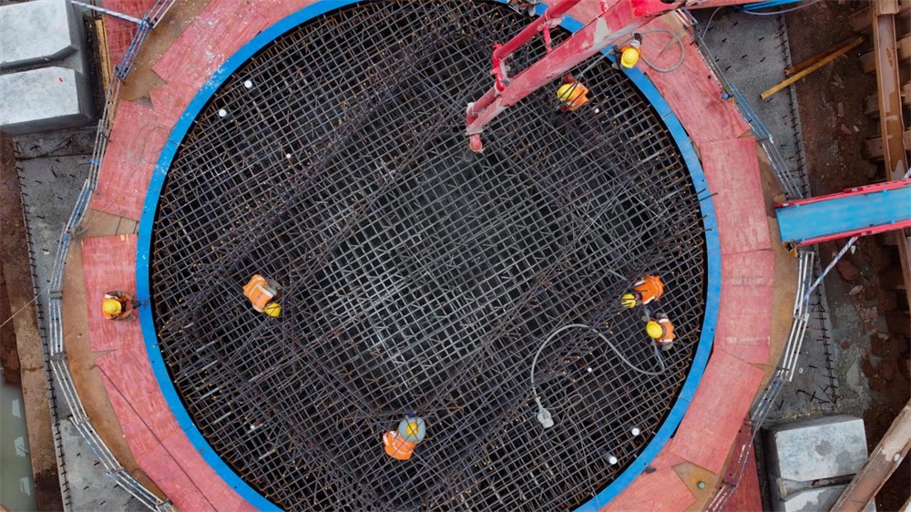 为了实现这一转体要求,37号主墩墩柱底部设置了转体结构——由上下转盘、球铰、撑脚、环形滑道、牵引系统和助推系统等关键部分组成,确保了转体的精确度和安全性。“针对当前的高温天气,在混凝土浇筑完成后,项目采用一步一模对混凝土进行养护,并采用洒水车定时对土工布进行洒水保湿,同时实验人员会每日定时对混凝土进行测温,确保墩体内外温差不超过设计规范,确保工程质量。”马辰介绍。