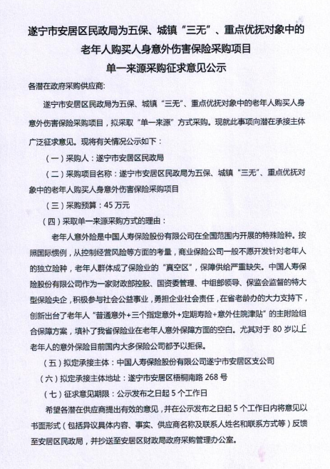 遂宁市安居区民政局为五保、城镇“三无”、重点优抚对象中的老年人购买人身意外伤害保险采购项目单一来源采购征求意见公示