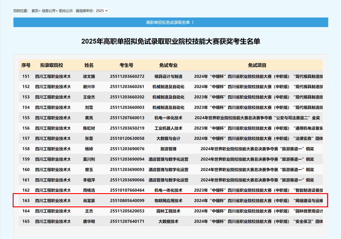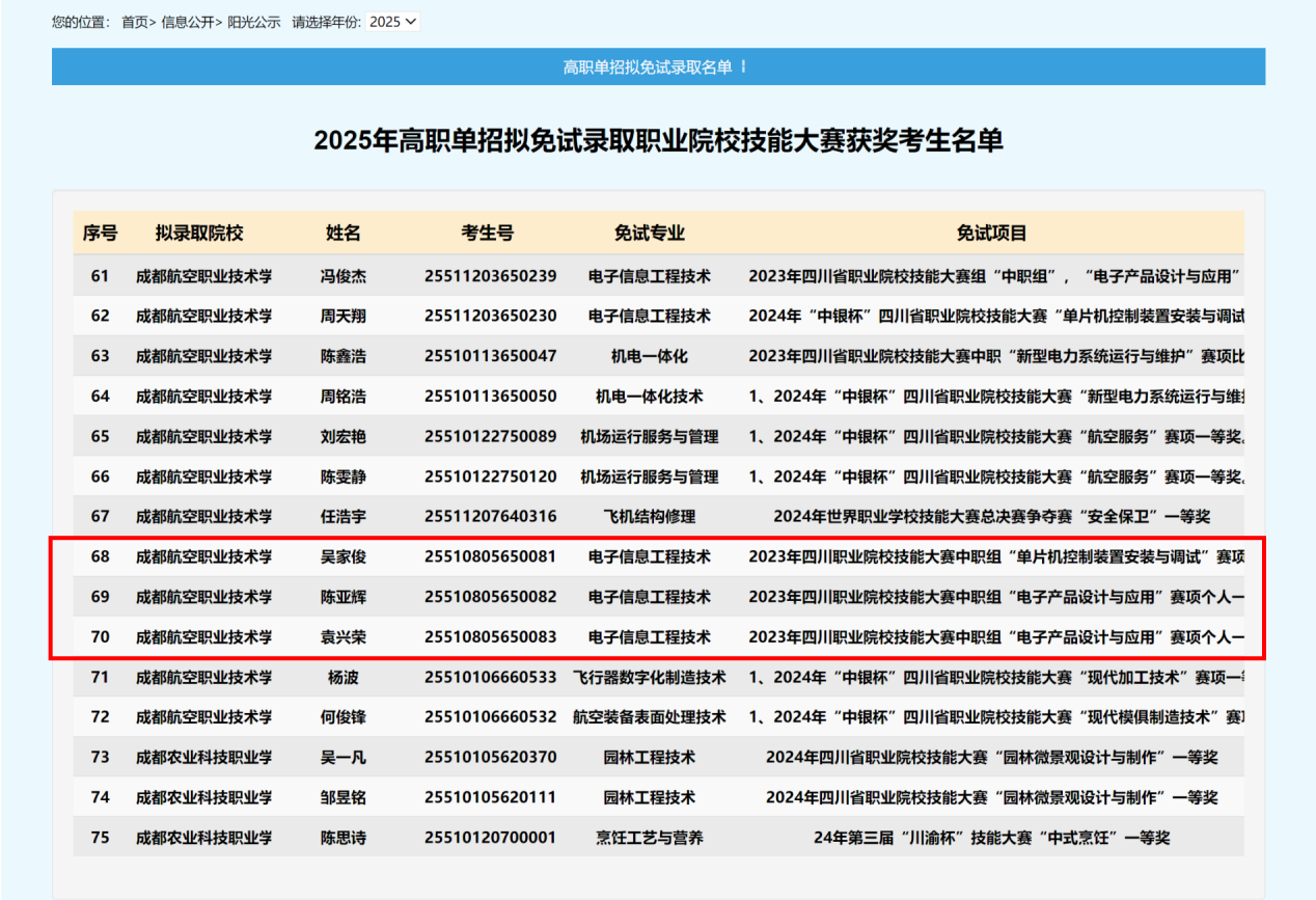 近日,四川省教育考试院公示了2025年高职单招拟免试录取名单,安居职中4名同学榜上有名,上榜人数居全市第一。其中,吴家俊凭借2023年四川省“中银杯”职业院校技能大赛(单片机控制装置安装与调试)第一名,陈亚辉、袁兴荣凭借(电子产品设计与应用)一等奖的优异成绩,被成都航空职业技术学院免试录取!肖富豪凭借2024年四川省“中银杯”职业院校技能大赛(网络建设与运维)一等奖的优异成绩,被四川工程职业技术大学免试录取!