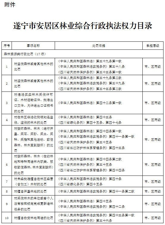 (一)实施方式:根据《中华人民共和国行政处罚法》第十六条及《中华人民共和国行政强制法》第十七条第二款的规定,按照《遂宁市人民政府办公室关于印发<遂宁市林业综合行政执法改革方案>的通知》(遂府办函〔2017〕142号),在市森林公安局的指导下,区林业局及各乡镇(街道)人民政府的配合下,区森林公安分局行使区林业局的大部分行政处罚权及有关行政强制措施。