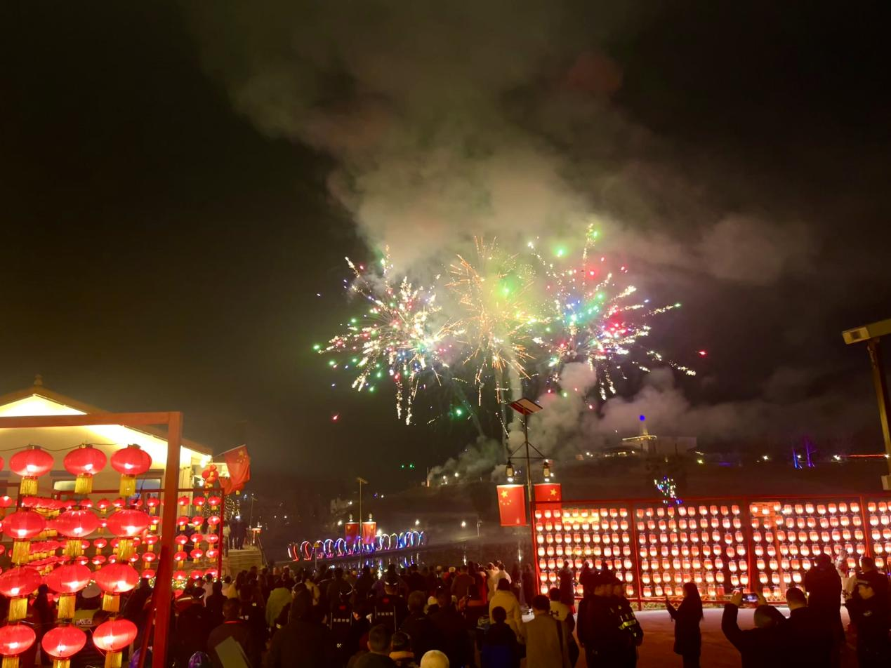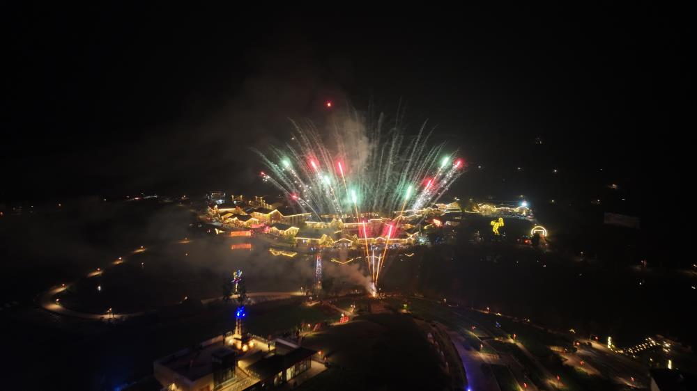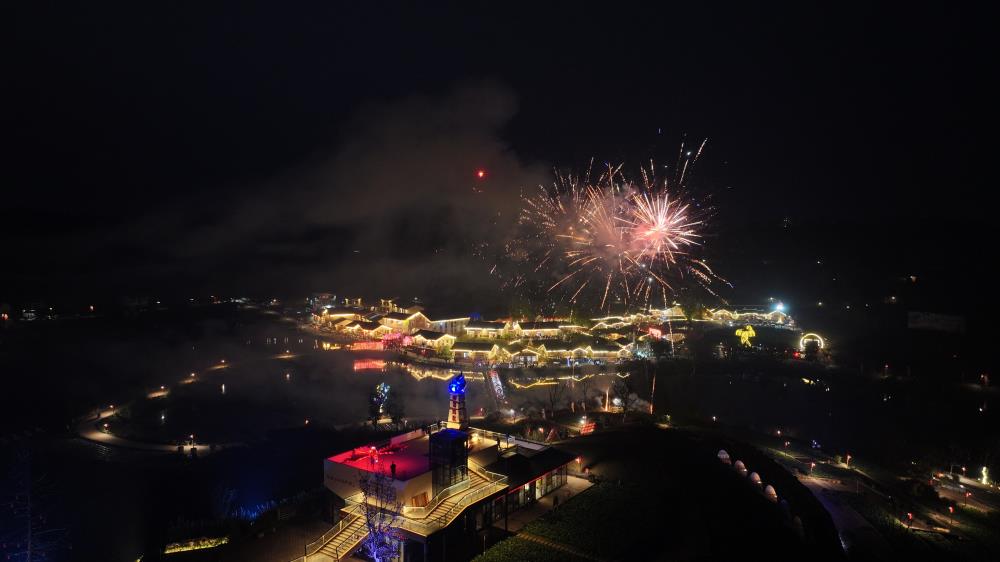 7点,夜幕降临,烟花秀与光影秀隆重登场,璀璨的烟花在空中绽放、光影凤凰迎风而起在空中盘旋,烟花与灯光的巧妙组合,营造出美轮美奂的灯光美景,华灯绽放于安居的夜色之中,映照着来年的繁荣新气象。