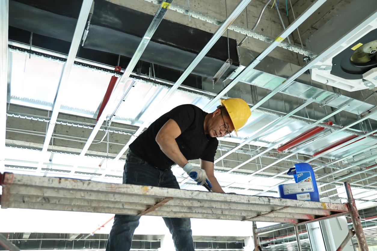 “目前消防、暖通、给排水系统及吊顶骨架已全部完工,整体施工进度达52%。”安居区托育综合服务中心项目负责人何祥介绍,接下来还将进行吊顶封板、地砖铺贴及塑胶地板铺设,预计7月底能完工初验。