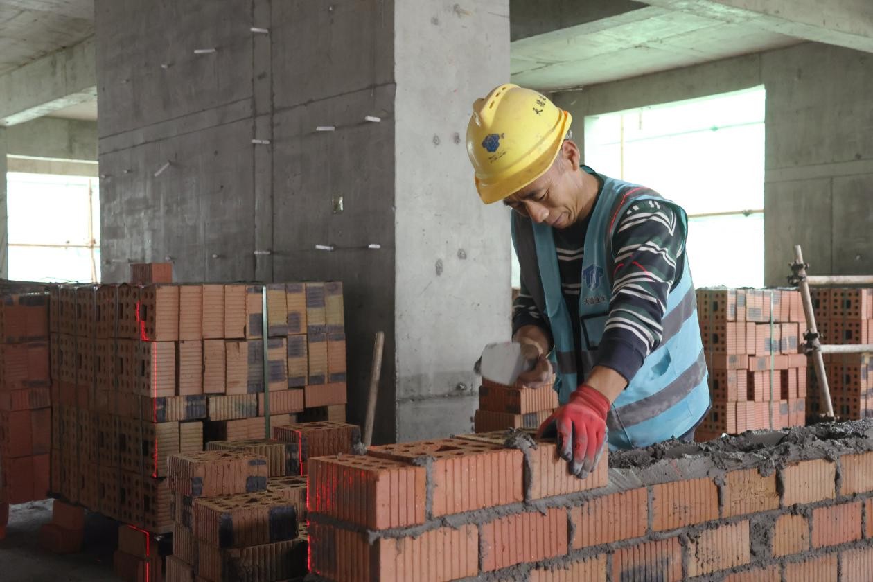 在林立的脚手架与覆盖整栋楼的绿色安全网里,电钻声、切割声此起彼伏。工人们各司其职,有的进行主体施工,有的则专注地进行室内砌筑与模板拆除,这承载着30余户家庭期盼的新家,正一天天“拔节生长”。