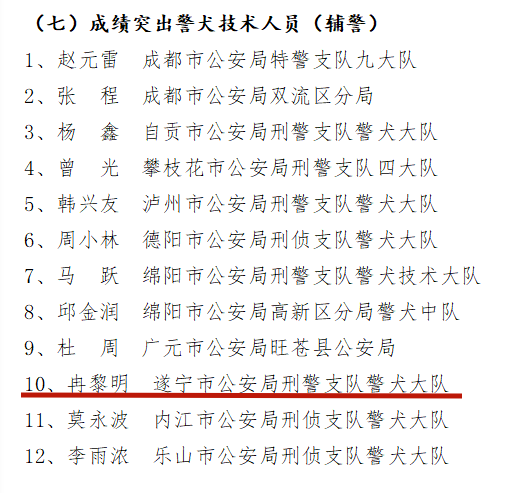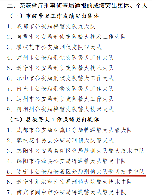 分局刑侦大队警犬技术中队先后被公安部五局评为“成绩突出集体”,被省厅刑事侦查局评为“实战用犬成绩突出单位”、授予“查缉先锋”荣誉称号,并在2023年全省警犬技术气味追踪科目实战化技能比武中获三等奖。此外,2022年、2023年连续两年在遂宁市公安机关刑事技术技能大赛中获“警犬”科目团体第一名。