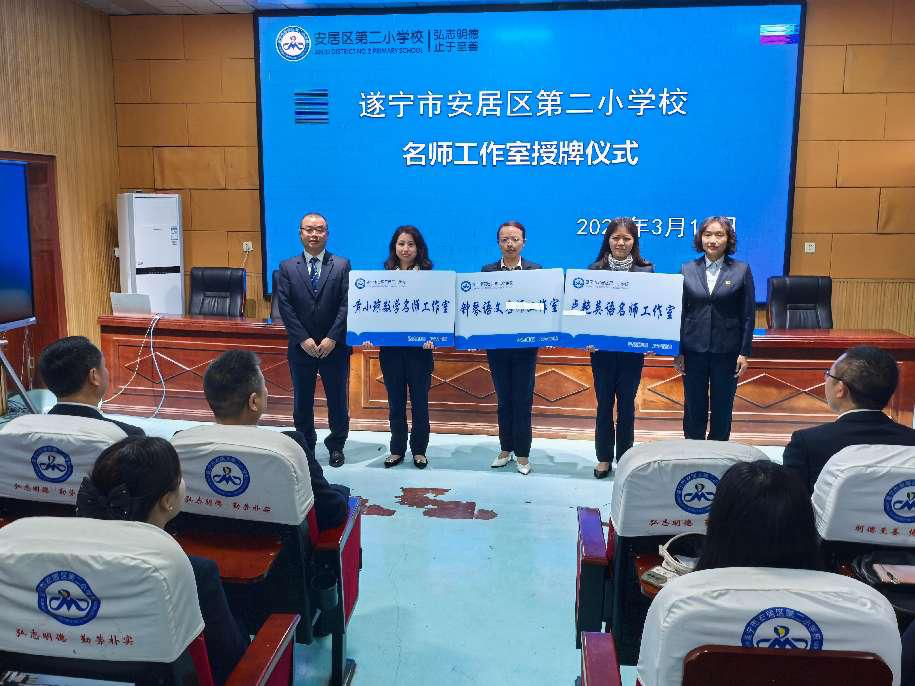 安居二小党总支书记谭春宏依次为语文、数学、英语名师工作室授牌。谭书记高度肯定了名师团队的示范引领价值,并强调:“名师是学校发展的核心引擎,需以‘头雁效应’激发‘群雁活力’。”同时,他要求全体教师以此次会议为起点,将规划转化为行动,将理念落地为实效,共同推动学校教育教学质量实现跨越式提升。