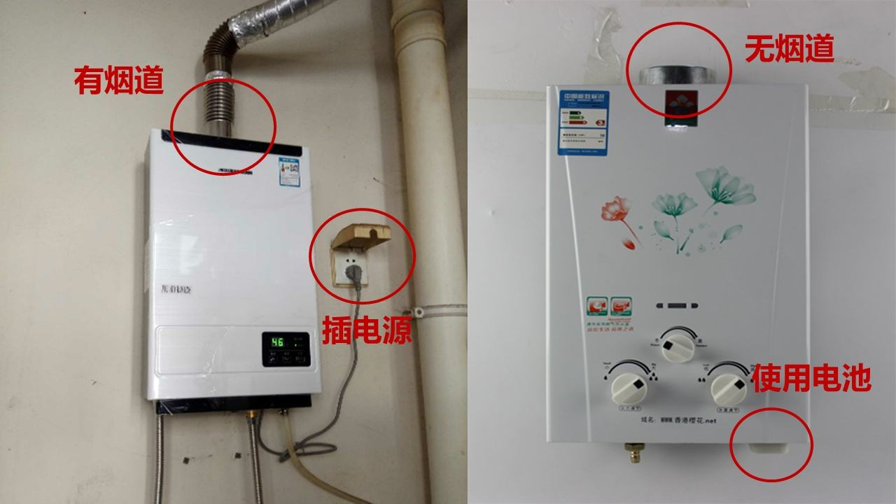 左图为强排式燃气热水器,右图为直排式燃气热水器