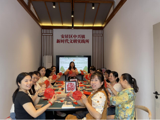 “我们特别设计了融合端午元素的剪纸图案。”中兴镇中心小学美术教师沈卯介绍道,“龙舟、粽子、雄黄酒等传统符号与现代剪纸技艺相结合,让传统文化以更生动的方式走进群众生活。”
